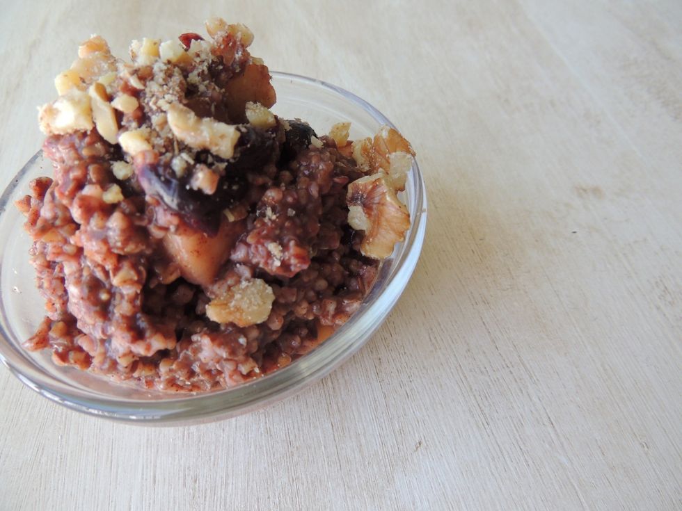 Cook the oats, add cinnamon and honey. Stir well. Add fruits. Stir well. Add optional ingredients. Stir well.