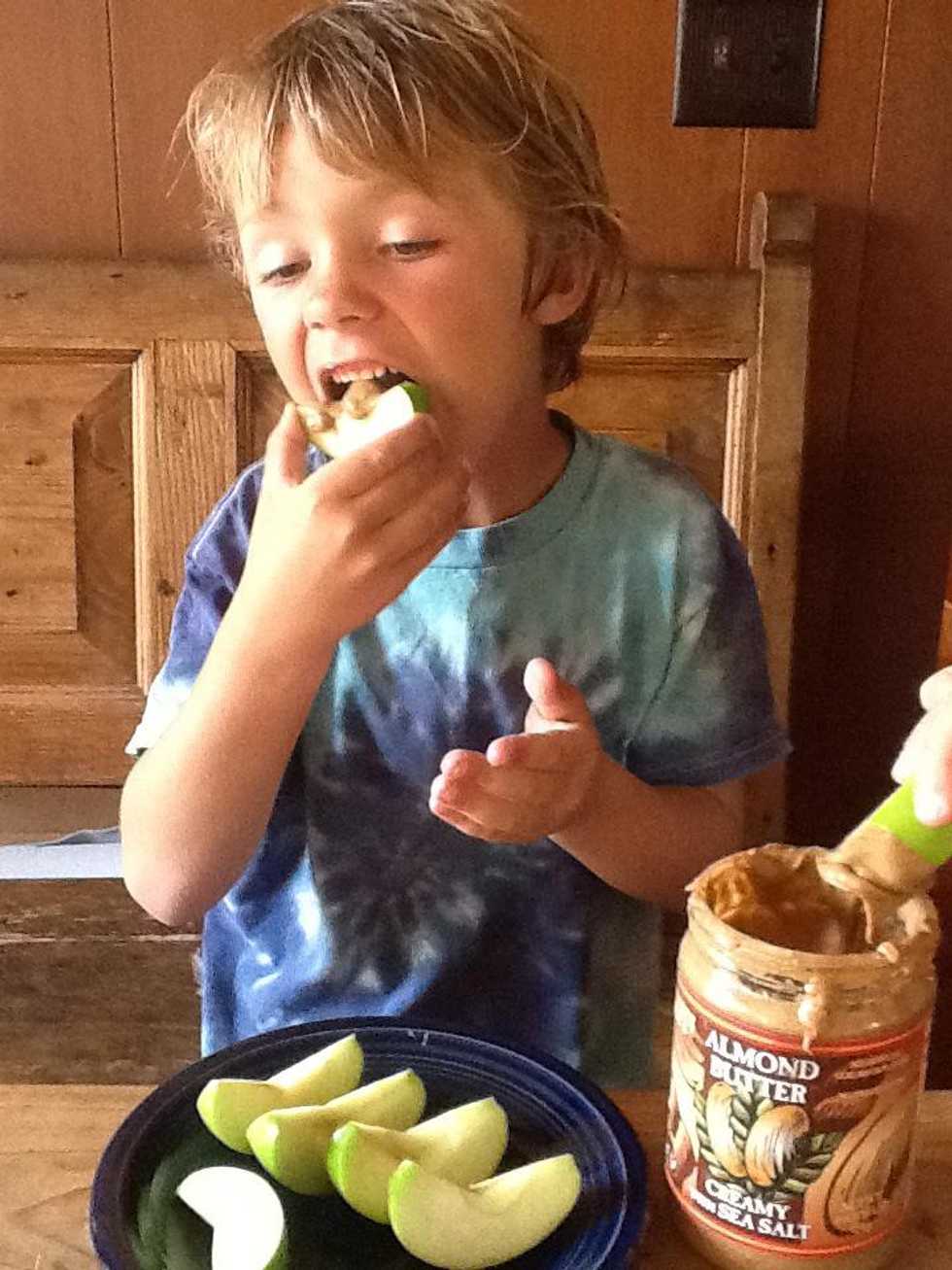 Carefully smear it on the apple slice. And be ready for your brother to want some too, because it is so yummy.
