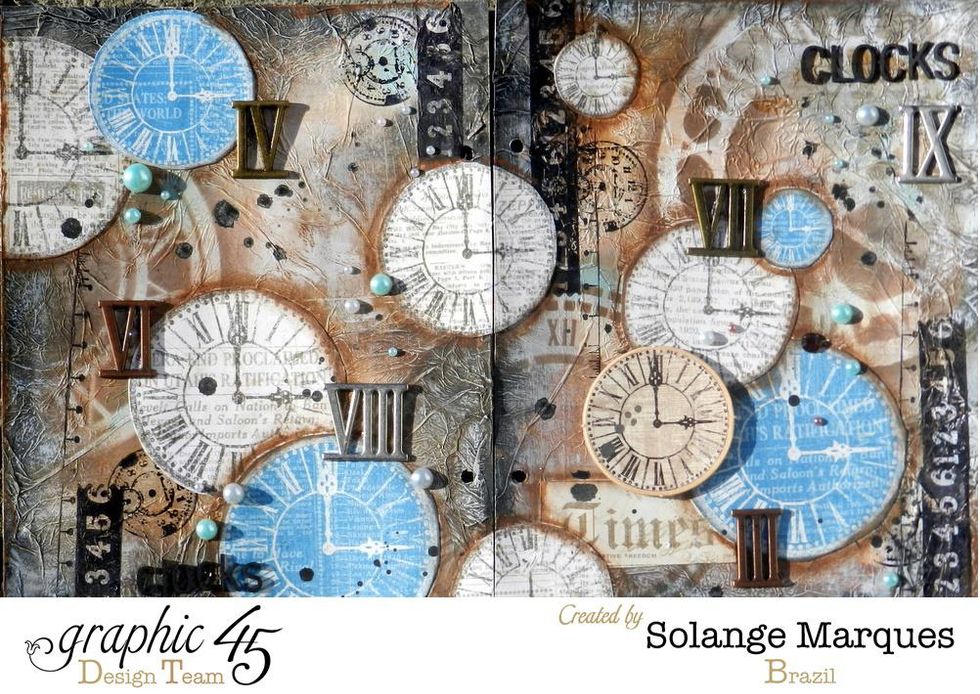 Cut out Clocks from Graphic 45 Times Nouveau Deluxe Collector’s Edition and glue them on the pages.