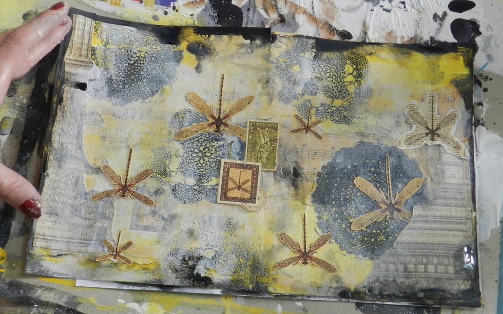 Cut out dragonflies from G45 Botanicabella collection and glue .them on the pages,