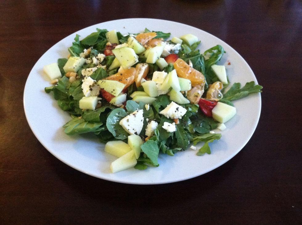 Throw the nuts, fruit, and cheese onto the arugula. My roomie thought some nectarines would be good. Why not? You can add whatever fruit you'd like, have fun with it.