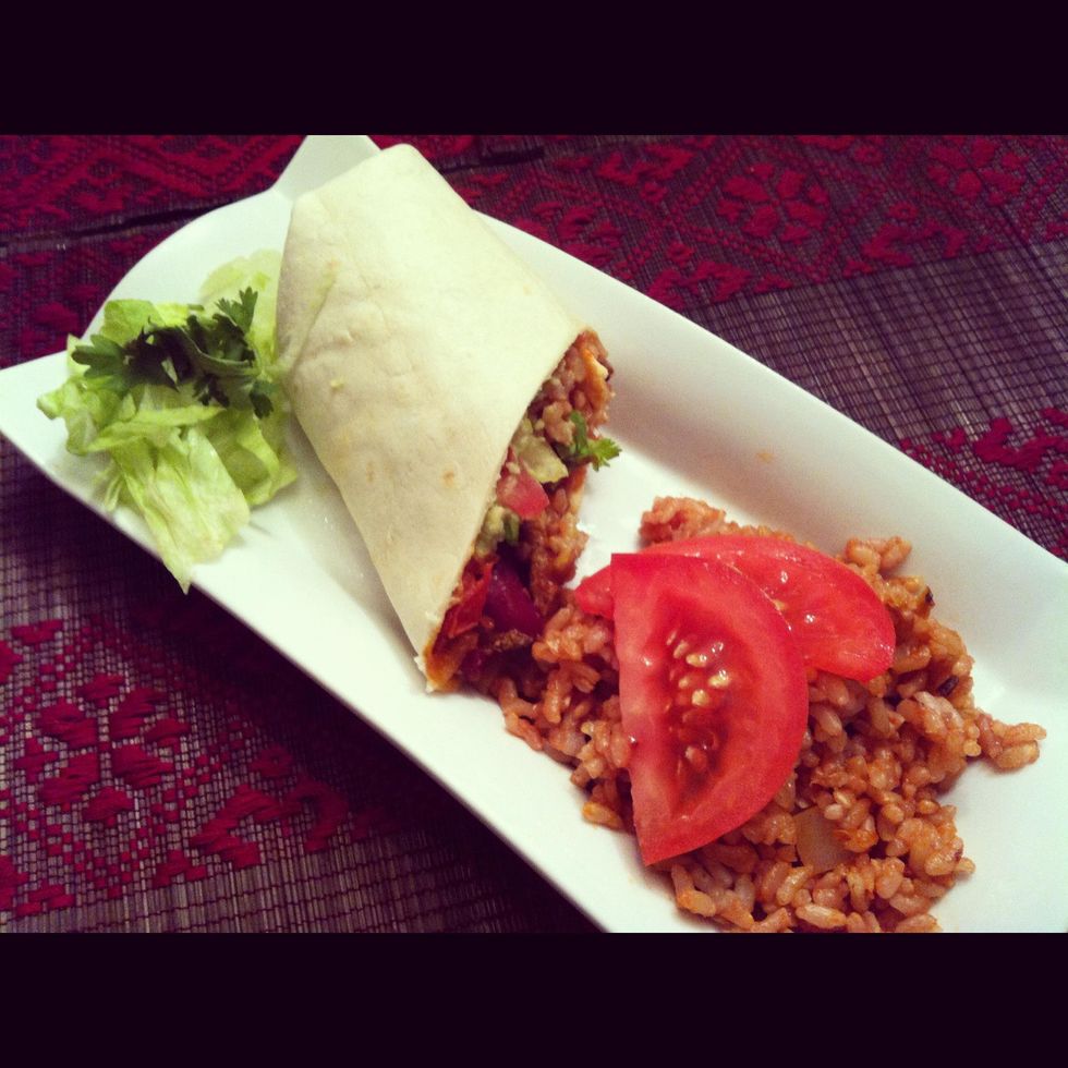 Arrange your burrito station!! Rice, guacamole, meats, tortilla shells (and cheese if you want, we didn't use cheese in this) and the delicious spicy bean mixture.