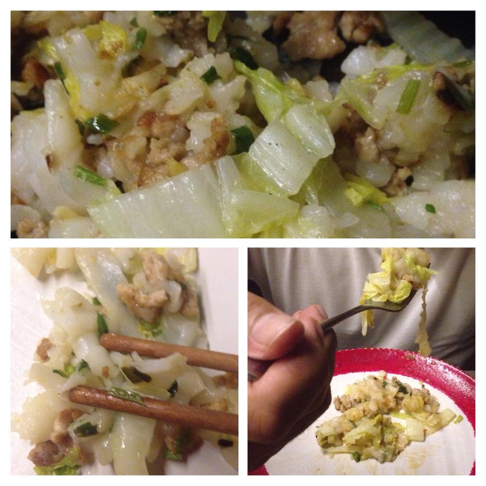 1.0tsp Chopped ginger4.0 Cloves of garlic 1.0 Spring onion2.0 Small chilli peppers (optional 1/2 Chinese Cabbage250.0g Ground Pork200.0g Fresh Rice Noodles1.0tsp Salt