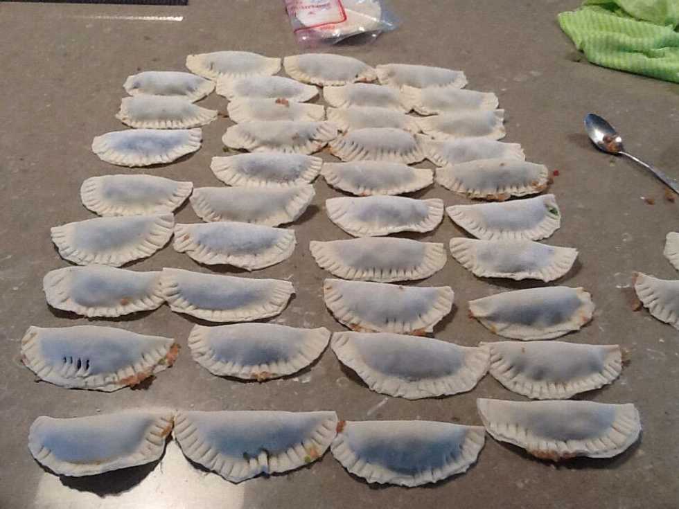 Take your gyoza's wonton wrappers and place a teaspoon of the pork mince and place in the centre of the gyoza wrapper