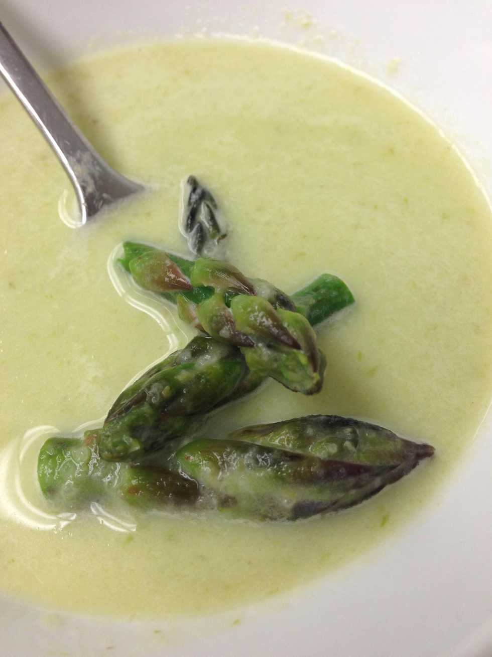 To serve, gently reheat the asparagus tips and arrange them in a bowl. Pour the soup. Enjoy!