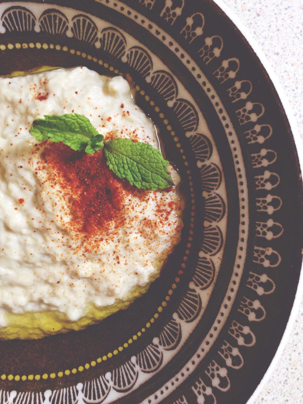 Place mixture in serving dish and garnish with olive oil, mint, and a dash of paprika or cayenne powder. Eat with toasted bread and enjoy - Sahtein! (To your health!)
