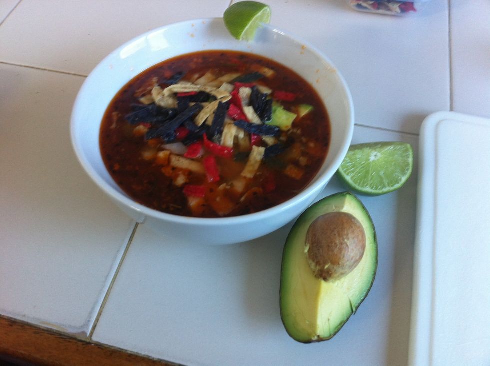 Once it's all simmered together about 30 min remove from the heat and let stand about 2 hours. Serve warm with avacado, diced onion and tortilla chips as garnish.