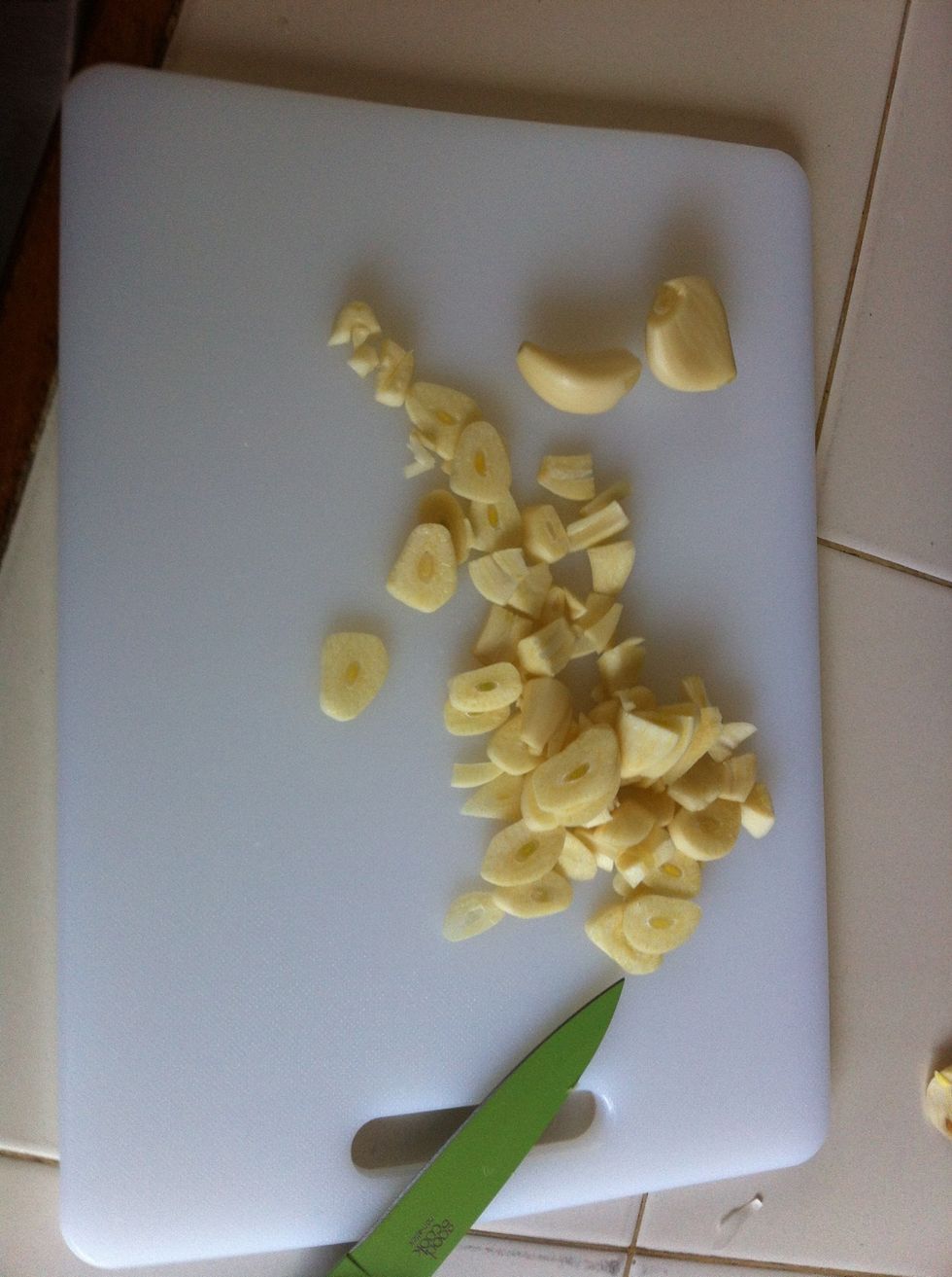 Peel your entire garlic bulb. Dice up all but two cloves and add to the water