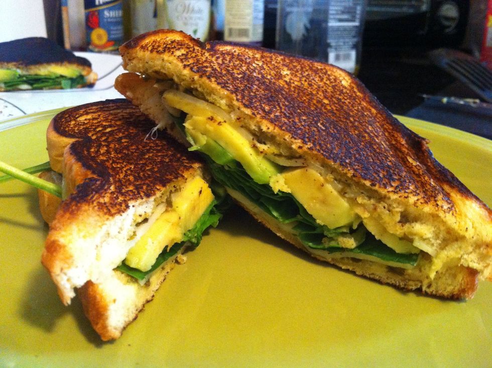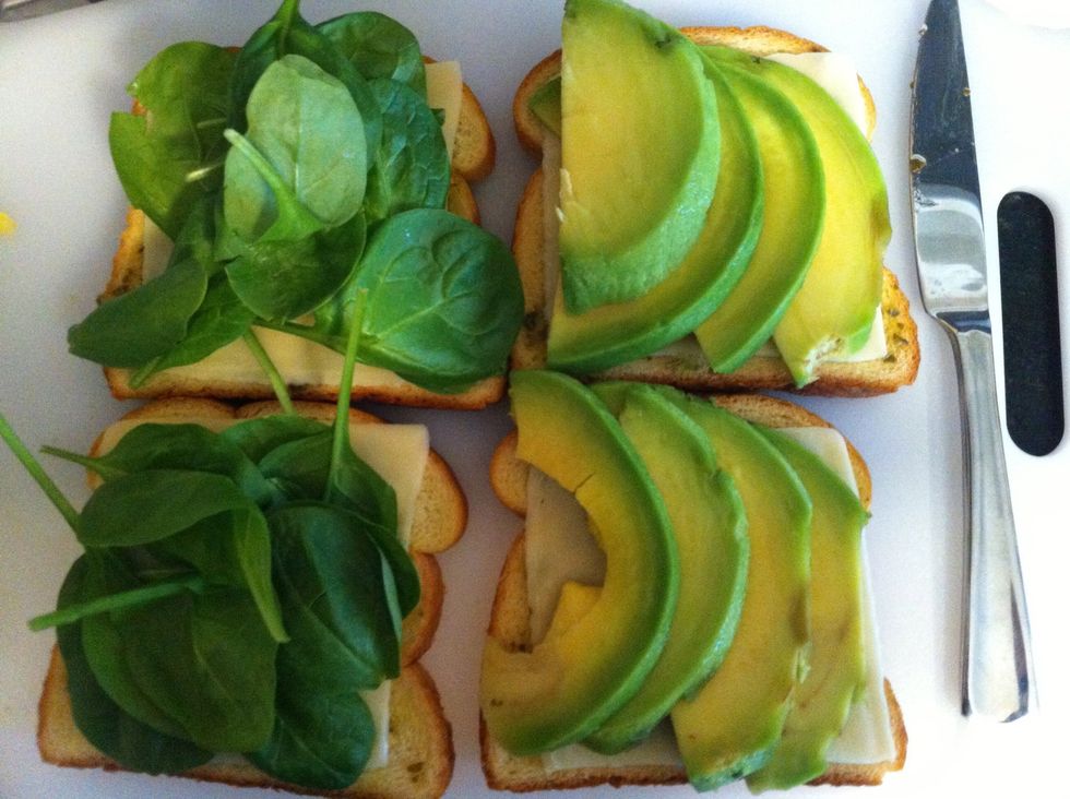 -Spread pesto sauce on both pieces of bread -Thinly slice avocados - 1 or 2 slices of cheese -Handful of spinach