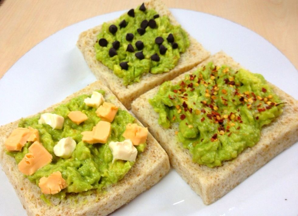 Traditional recipe calls for avocado-fresh tomato-cheese on top of a toast. But I use this kind of cheese lol same thing :) provencal style tomatoes. Open 2-3 cubes and crumb it on one of the slice
