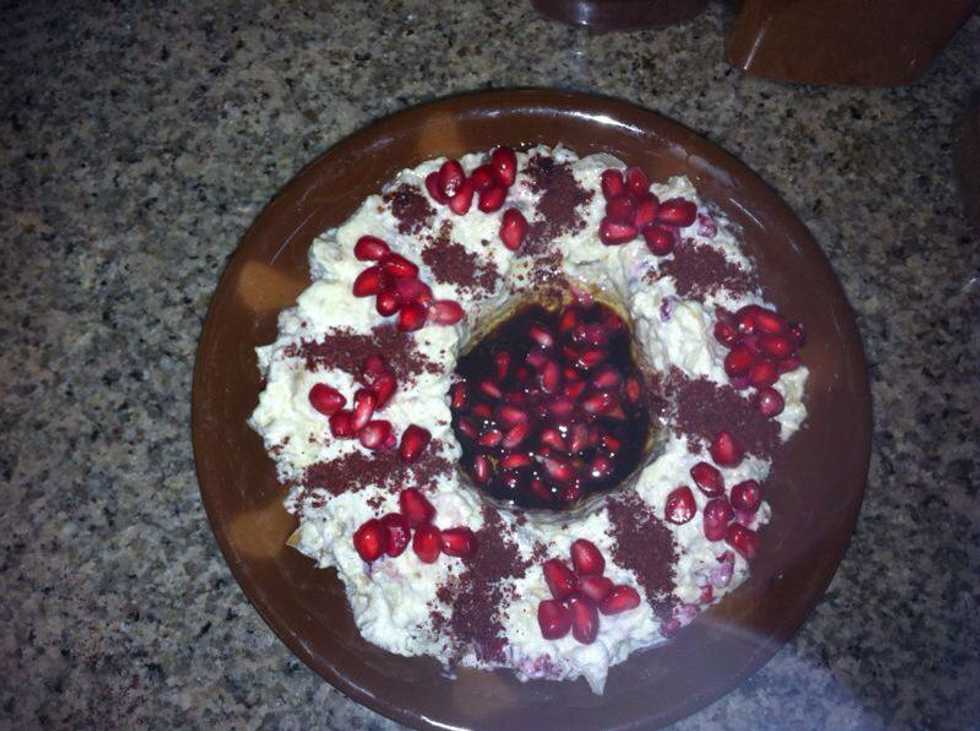 Add 2 Tablespoons of pomegranate molasses and more pomegranates in the crater. Cover in plastic wrap and chill for an hour or two before serving. Serve with pita chips or pita bread or any flat bread!