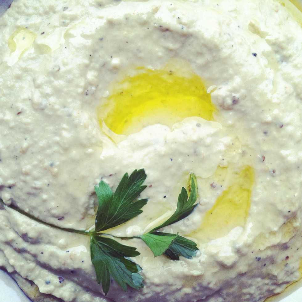 In a food processor add 1/4 c tahini; 2T lemon; 1/2t salt, a pinch of cayenne and 1 clove garlic pressed.