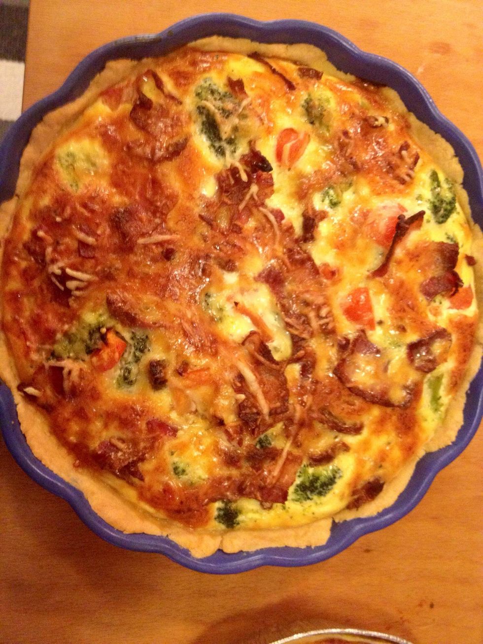 Sprinkle the grated cheese on top of the filling. Then pour the egg & milk mix on top. Cook in the oven for about 35 minutes.
