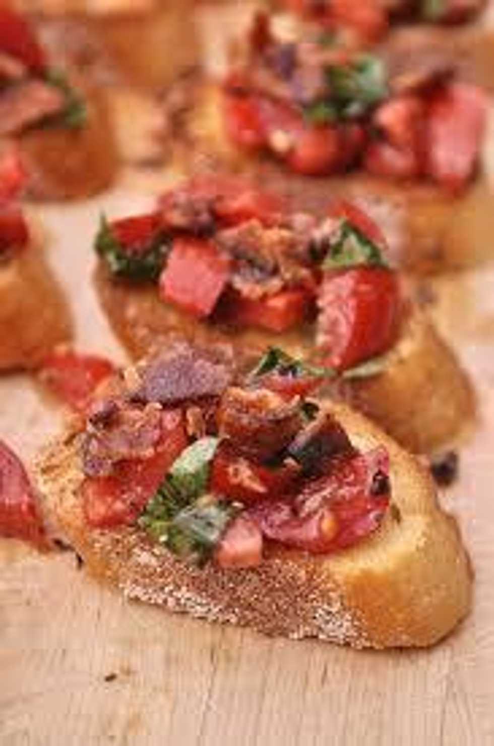 4.0Tbsp Olive oil2.0 Roma Tomatoes3.0Tbsp Fresh basil1.0Tbsp Chopped Capers1.0Tbsp Chopped Olives1/2tsp Salt1/2tsp Pepper5.0 Bacon strips1.0 Sliced Baguette1.0 Medium bowl1.0 Cooking pan1.0 Small bowl