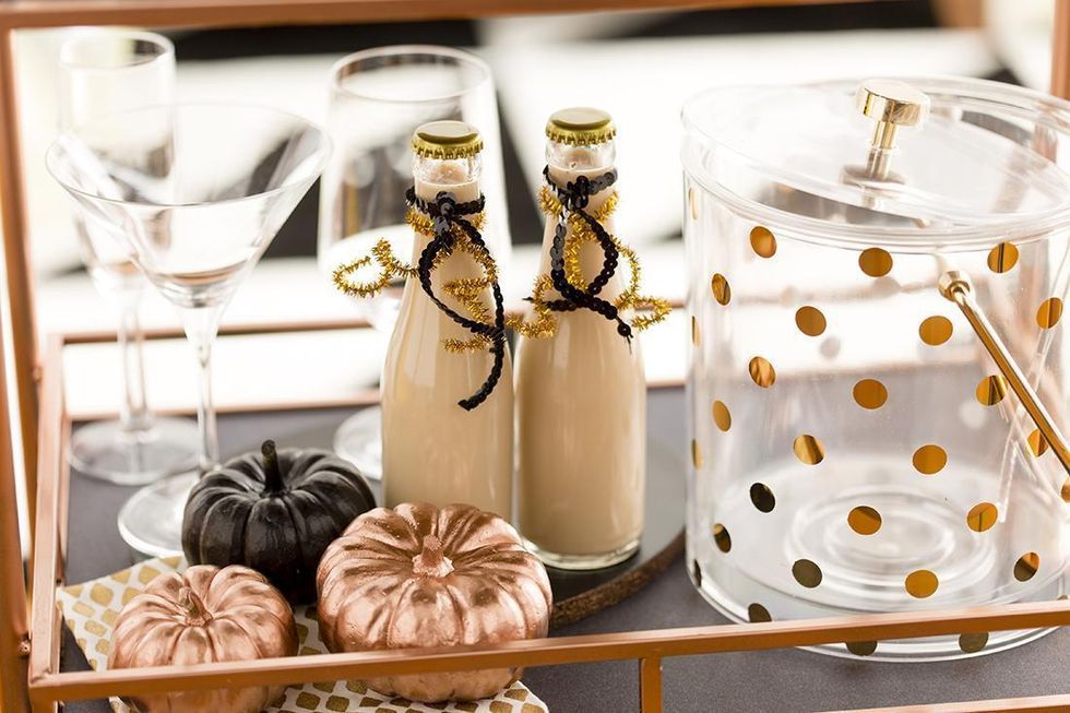 Decorate your bottle to give the cocktail an extra fancy touch. We tied gold pipe cleaner and black sequin ribbon around the top. But feel free to experiment!