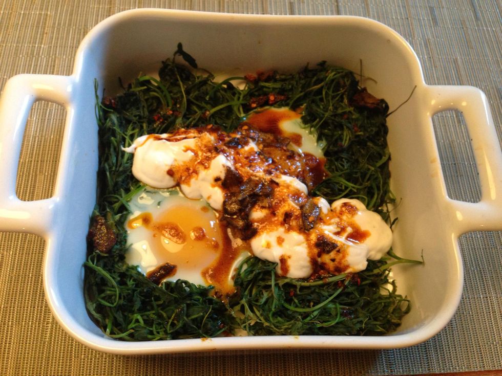 When the eggs have cooked, remove from the oven. Spoon the yogurt over the center, and then pour the hot chile butter on top of that. Enjoy immediately.