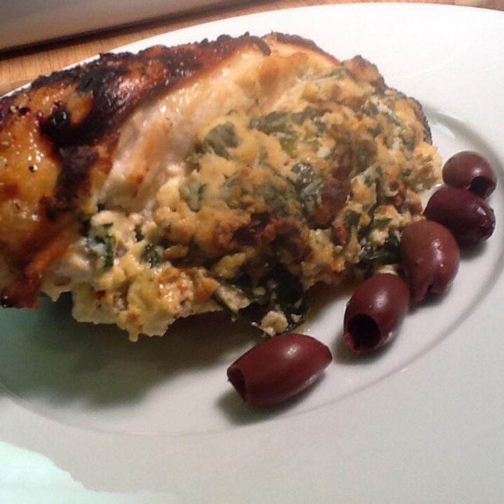 The chicken breast comes out with a nice crisp. I garnished with greek olives.