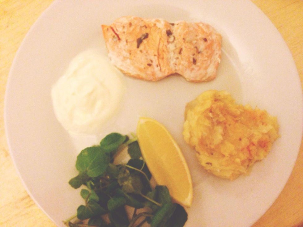 Ingredients: salmon fillet, garlic sea salt, fry light butter, salad, parsnip, cayenne pepper
