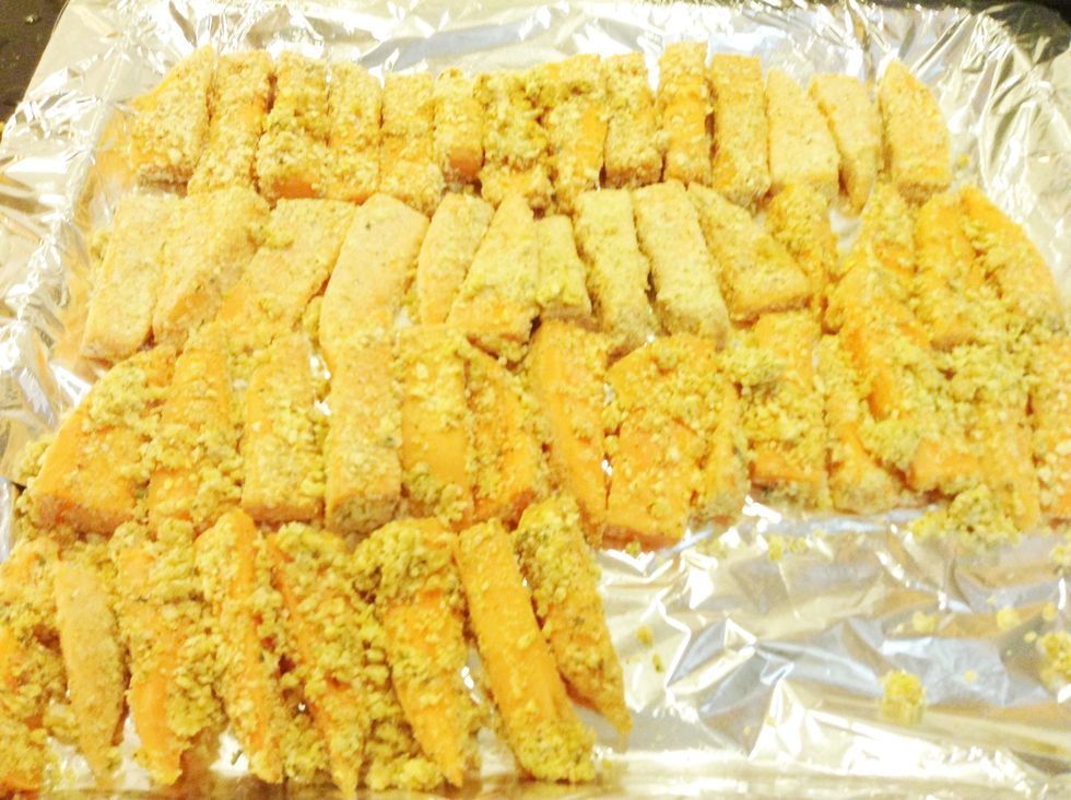 Dip the potatoes in egg white. Fill a bag with the crumbs and seasoning. Put the potatoes inside and shake! Place them on a foil-covered baking tray.
