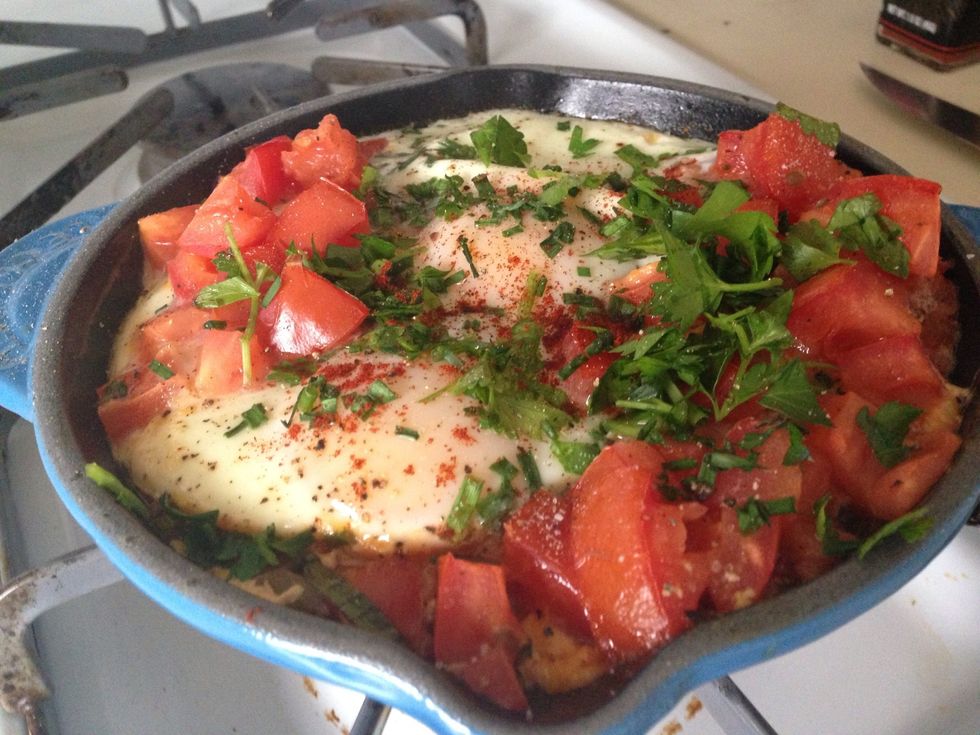 Bake 5-8 minutes, or until yolks are cooked to your liking. 5 minutes will give you really runny yolks, but I like mine just a little runny, so this was 8 minutes. Serve right out of the skillet!