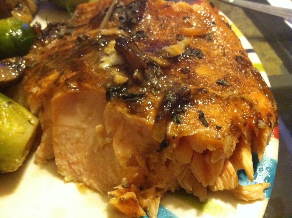 Pour the sauce on it, heat up your oven to 400 degrees . Do not cover the salmon leave it in the oven , for 13/14 minutes until it's flaking.
