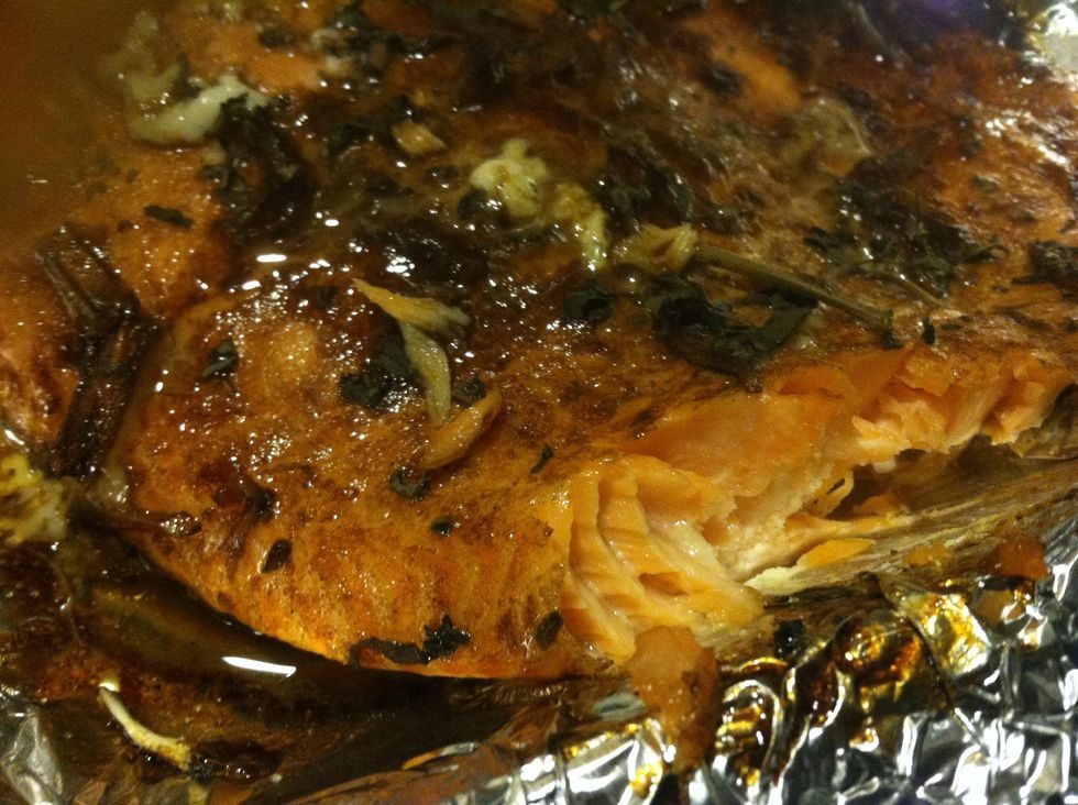 Pour the sauce on it, heat up your oven to 400 degrees . Do not cover the salmon leave it in the oven , for 13/14 minutes until it's flaking.