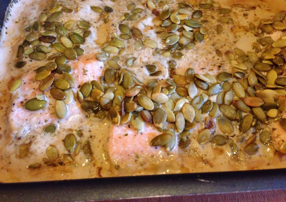 Sprinkle the pumpkin seeds on top. Cook in the upper part of the oven for about 15 min.