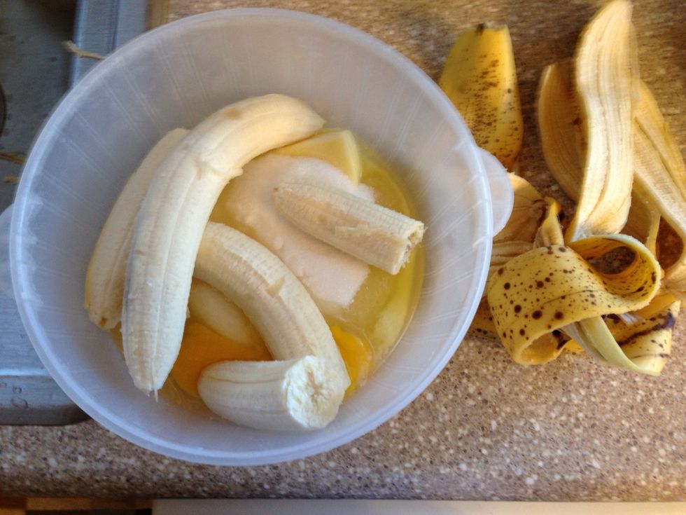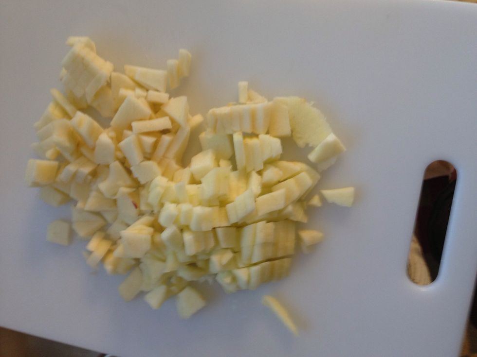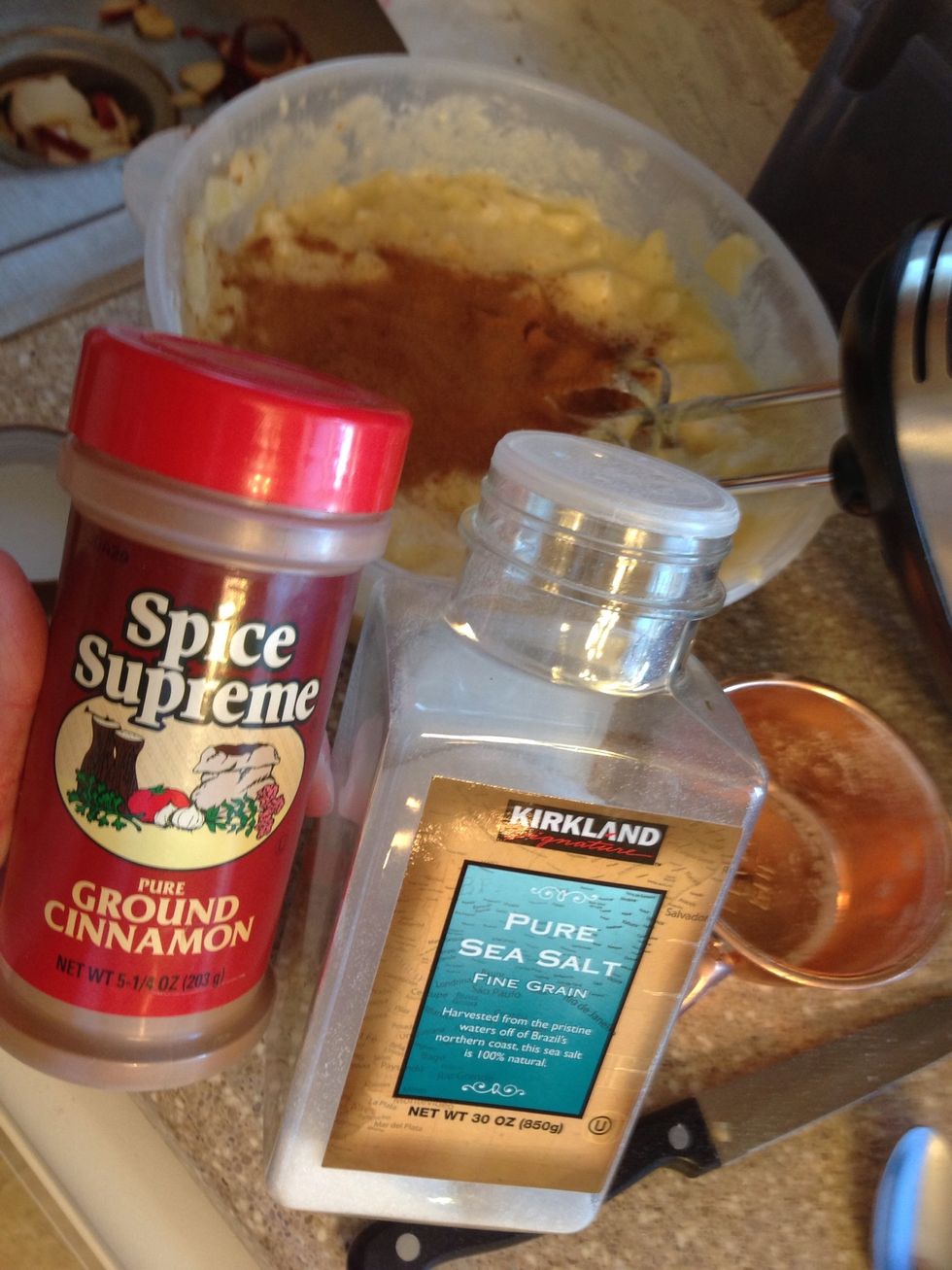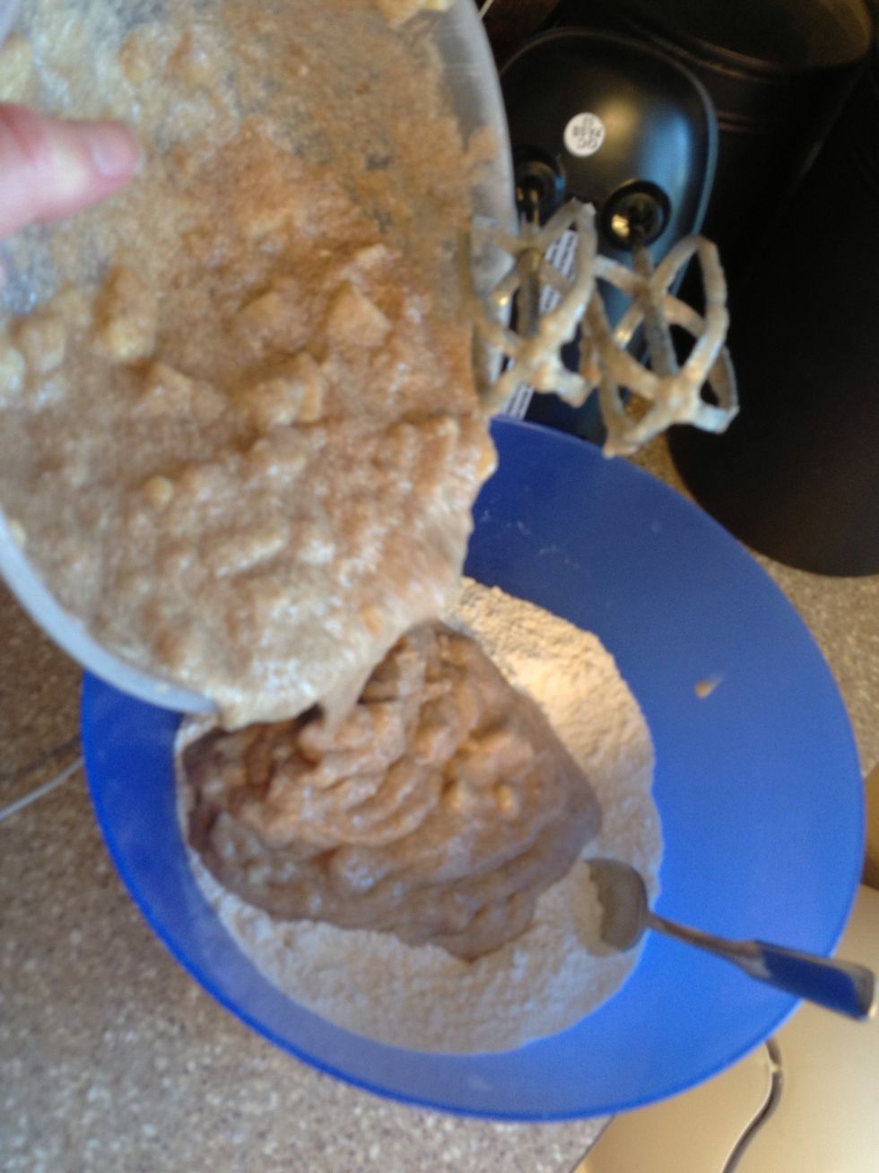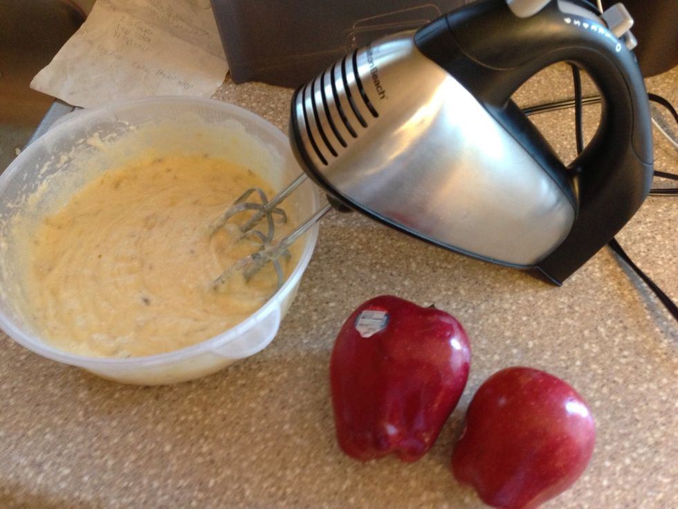 Peel and dice three apples. Fold apples into banana mixture. Generously add cinnamon