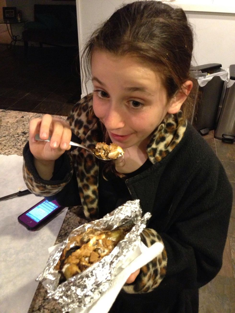 Now sprinkle on the chocolate chips and marshmallows. (For healthier version, replace marshmallows with finely diced fresh strawberries.)