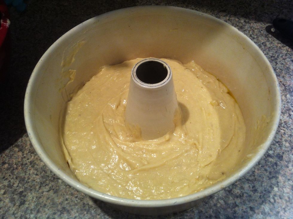 Grease up a bundt pan, and turn on your oven. Preheat it at 350 degrees.