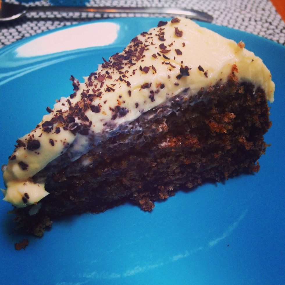 Let the cake cool; if you're in a hurry place it in the freezer for a while, to prepare it for the frosting.
