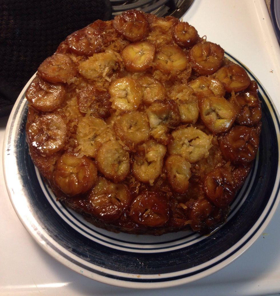 Pour half of the brown sugar mixture into each of the 2 round cake pans over the bananas.