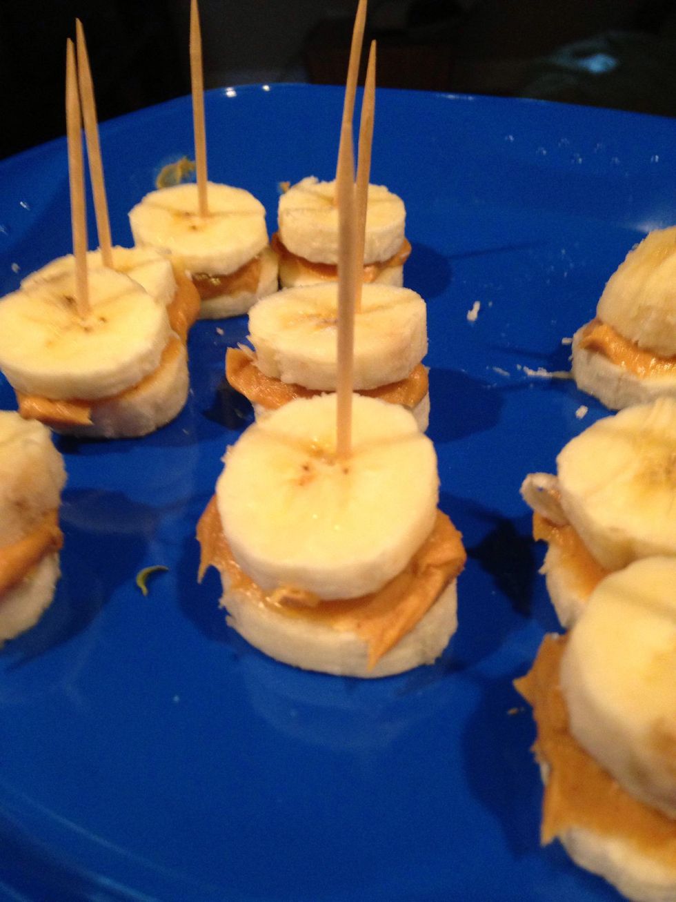 Sammich the PB with another banana slice, then stick a toothpick in each, and freeze for an hour, two if you have time. If you have little humans, popsicle sticks should do the trick.