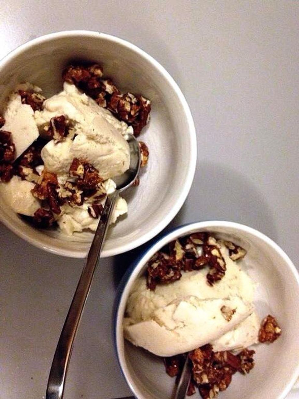 Sprinkle the pecans on top of the ice cream!