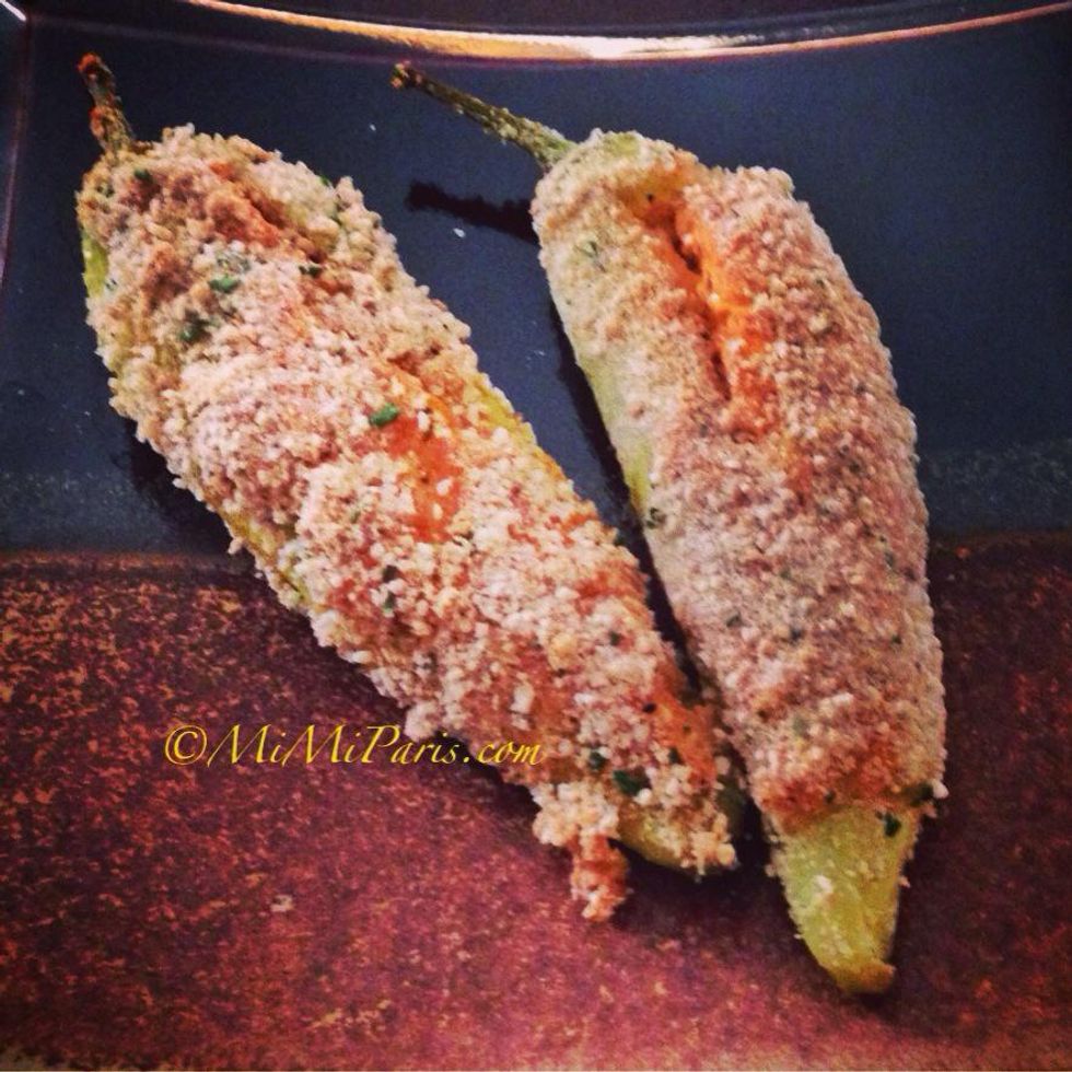 Mix cream cheese, cheese, paprika and cayenne pepper together. Stuff each pepper with the mix.