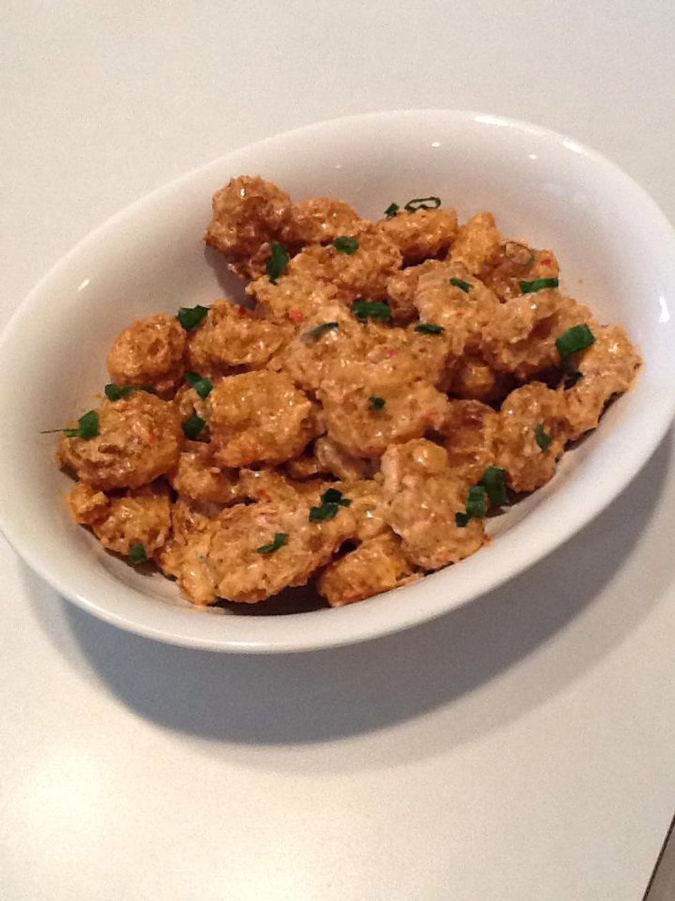 But for those who want a bang-bang kick, pour the sauce you made earlier over the shrimp and toss lightly to coat. I also add a few chopped green onions for presentation. Serve and enjoy!