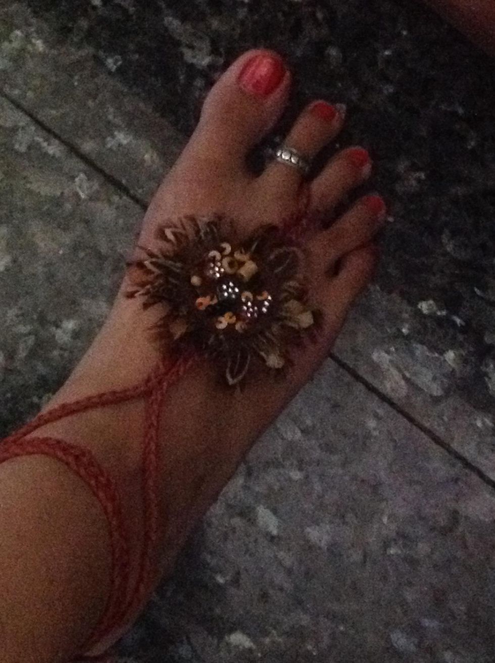 See in this picture where to stitch up the two plaits together and where to stop, so that they get separated and can go around your ankle. You can wear these at the beach!