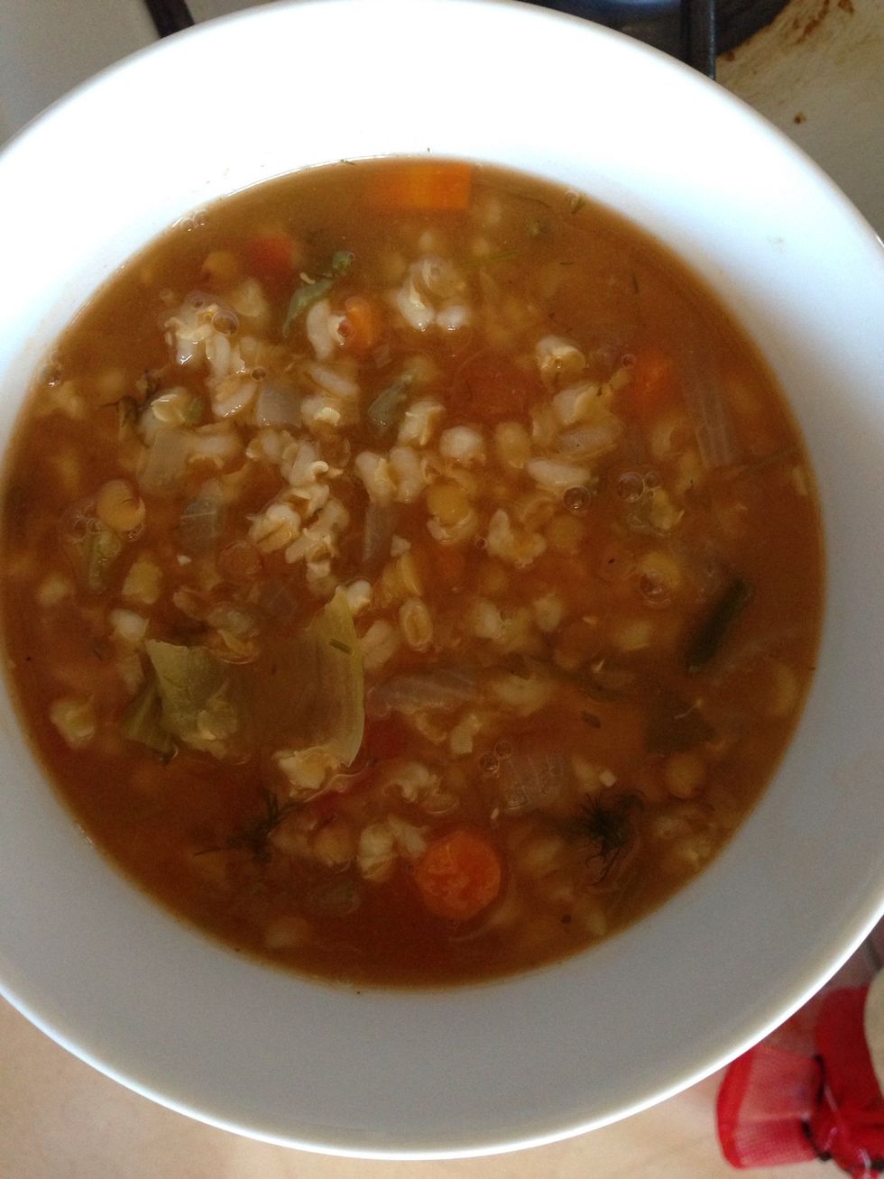 Add the vegetables and 1 cup of barley to the broth. Bring to a boil then set flame on low and simmer for 25 minutes. Add the lentils and tomatoes and cook for 20 minutes more.