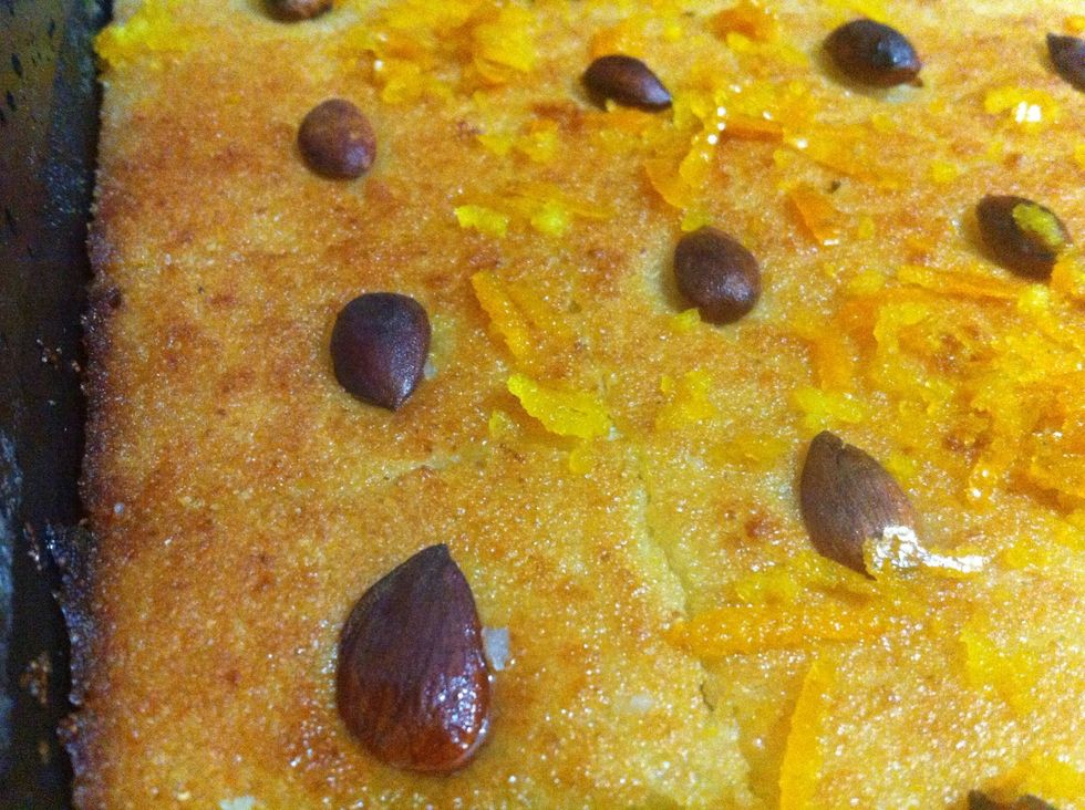 Cut squares of the semolina cake so that it absorbs the syrup nicely. Pour hot syrup when it's done over it. You can strain the syrup to get rid of orange rind. Optional
