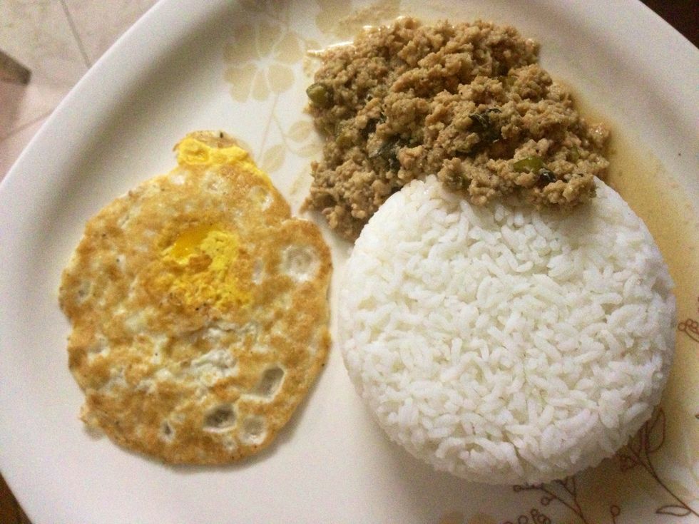 Serve hot with fried egg and steamed rice