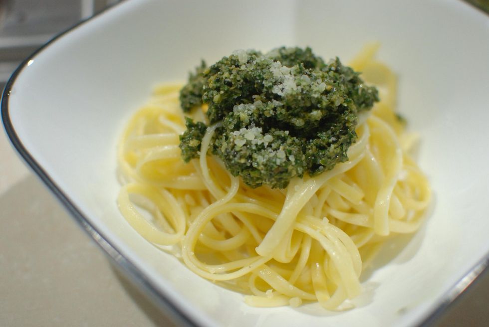 Drop in 3 cloves of garlic, blanched basil, toasted pine nuts and a dash of salt into a food processor.