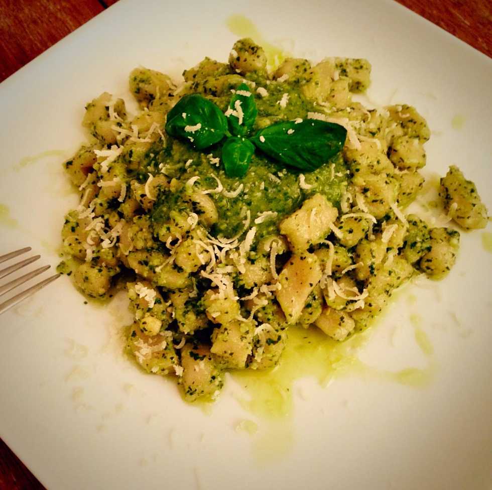 Drain your choice of pasta, here I am using baby gnocchi, and stir the sauce in. Plate and garnish with some extra sauce and olive oil, as well as a light dust of parmesan if you want. Enjoy!