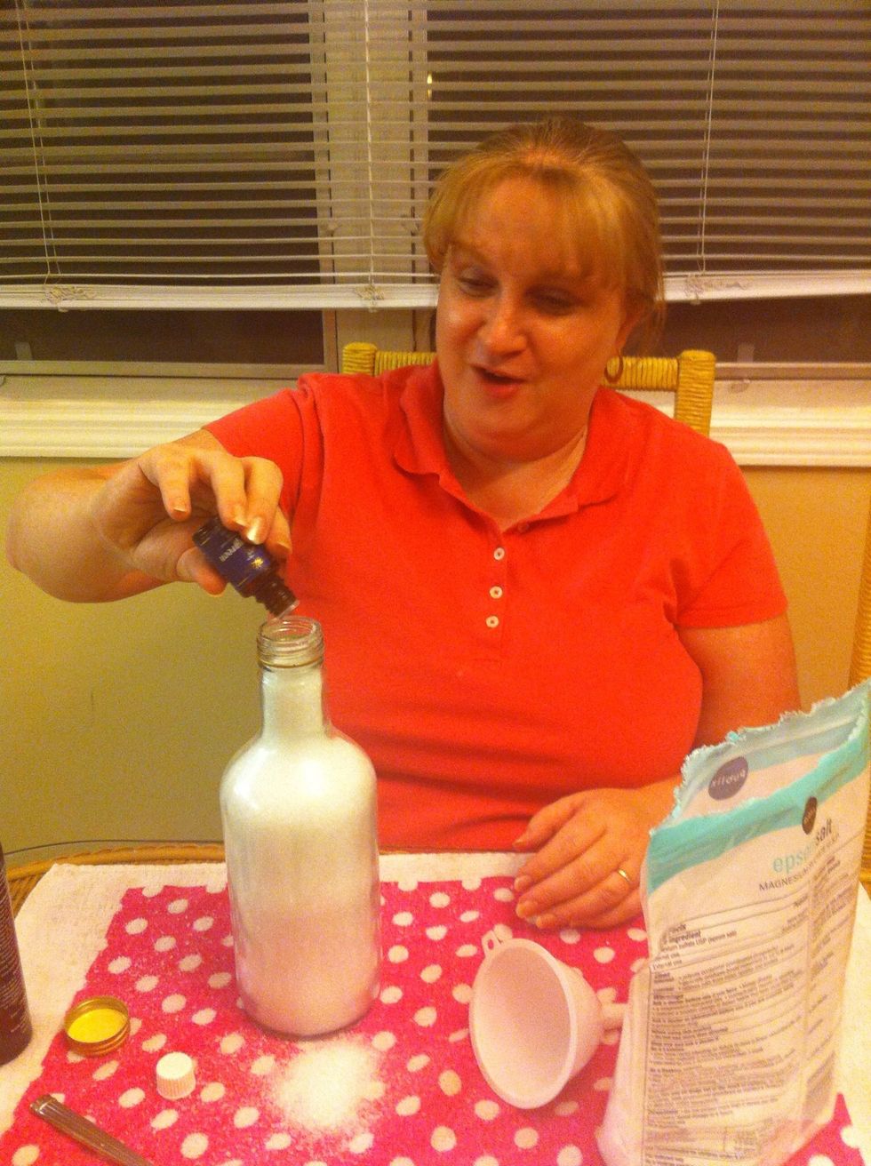 Add a decorative touch by adding a piece of fabric tie to the container. And wa-la! Your very own bath salts! It's so much fun and knowing you made it makes it even better!
