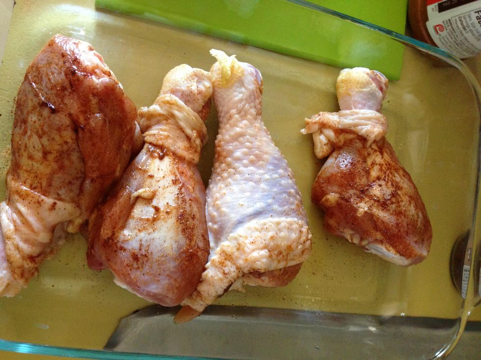 Wash the chicken- clean of any membrane and extra fat/skin. Towel dry and set in your baking dish. Also set your oven at 375 degrees.