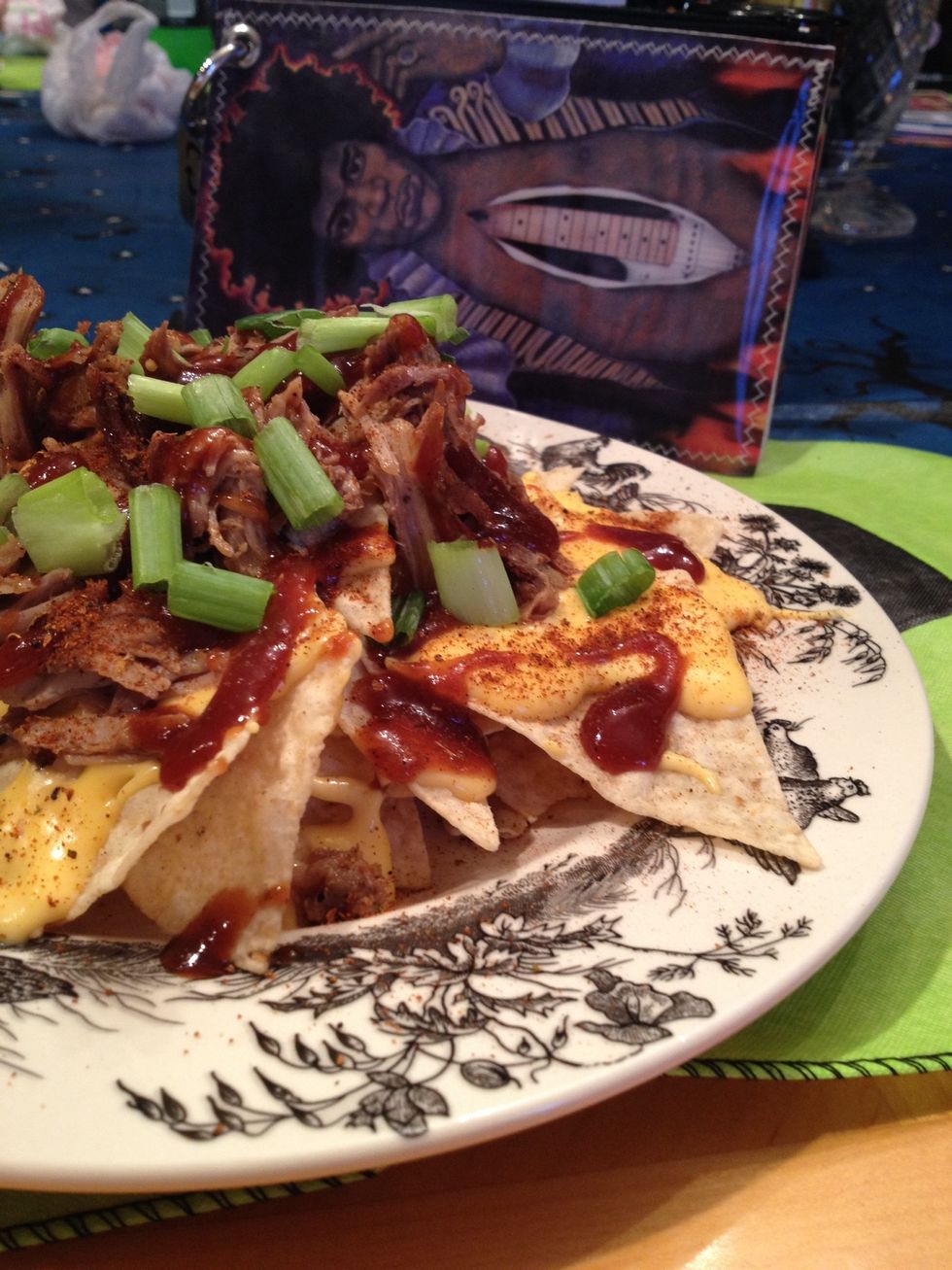 And assemble. I had a Boston Butt pulled pork and I heated it & added a little Secret 6 BBQ sauce) Add chips, velveeta, pulled pork, BBQ sauce, seasoning & green onions (optional)