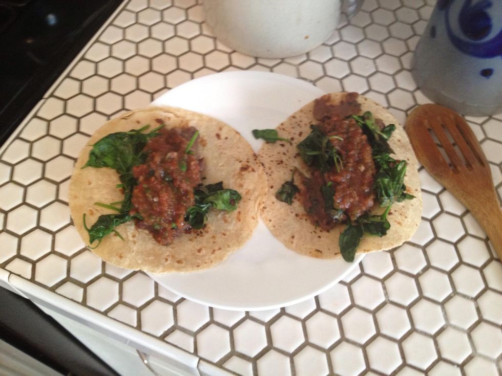Split ingredients in two and scoop onto tortillas. Add a tablespoon or so of salsa to each.