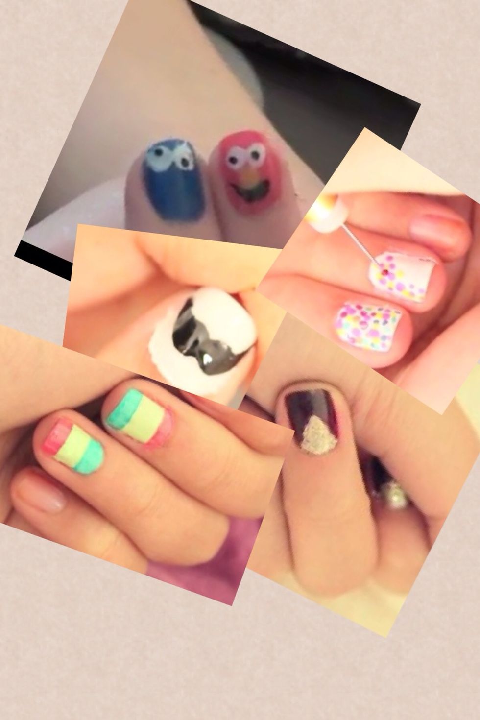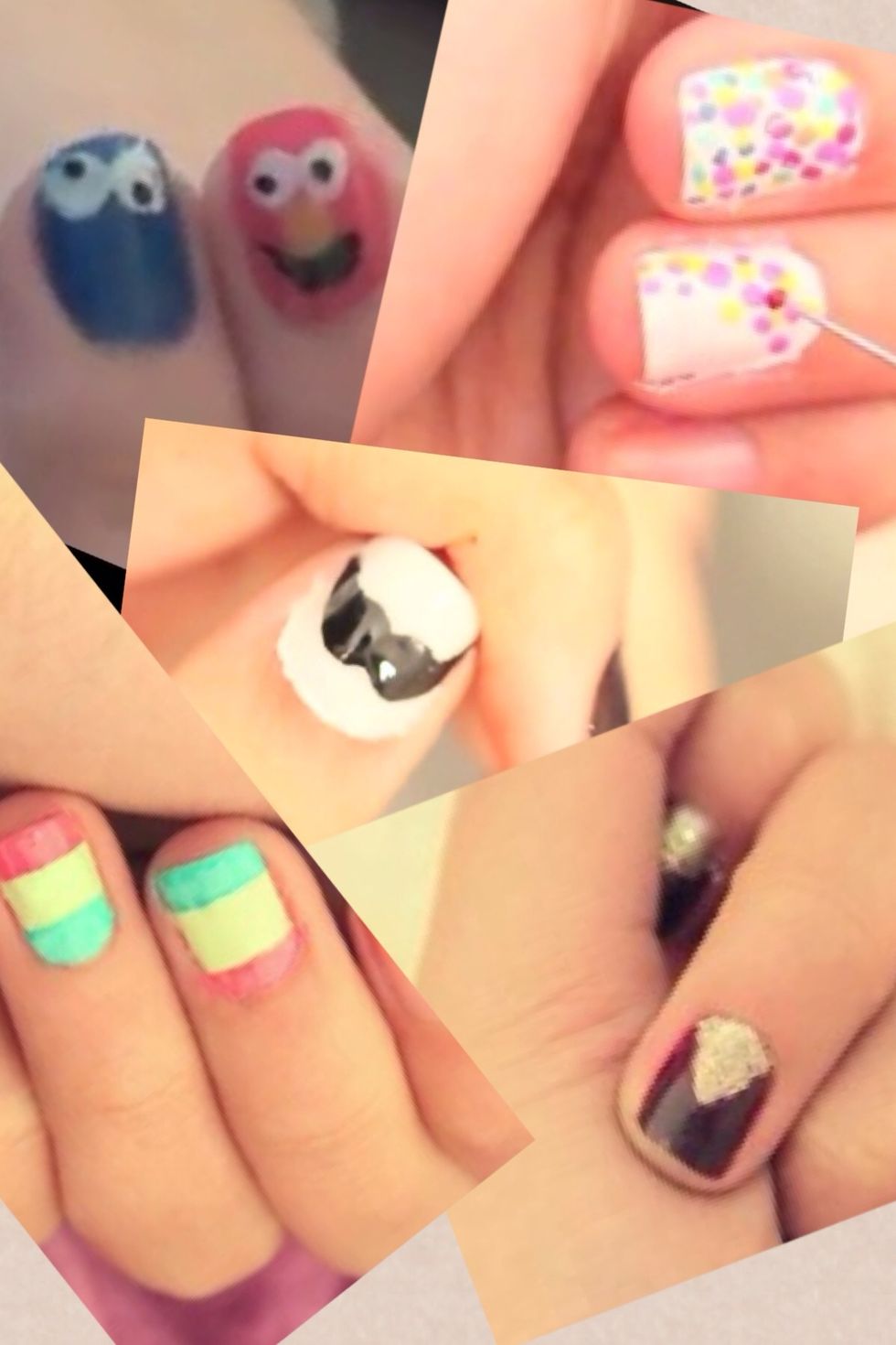 Elmo and cookie monster in your nails! You need blue, red, yellow, white and black nail polish and a bobby pin..
