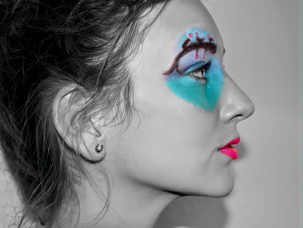With the light blue eye shadow, draw on the rest of the white area. Take an dark eyeliner, and paint your eyebrow.