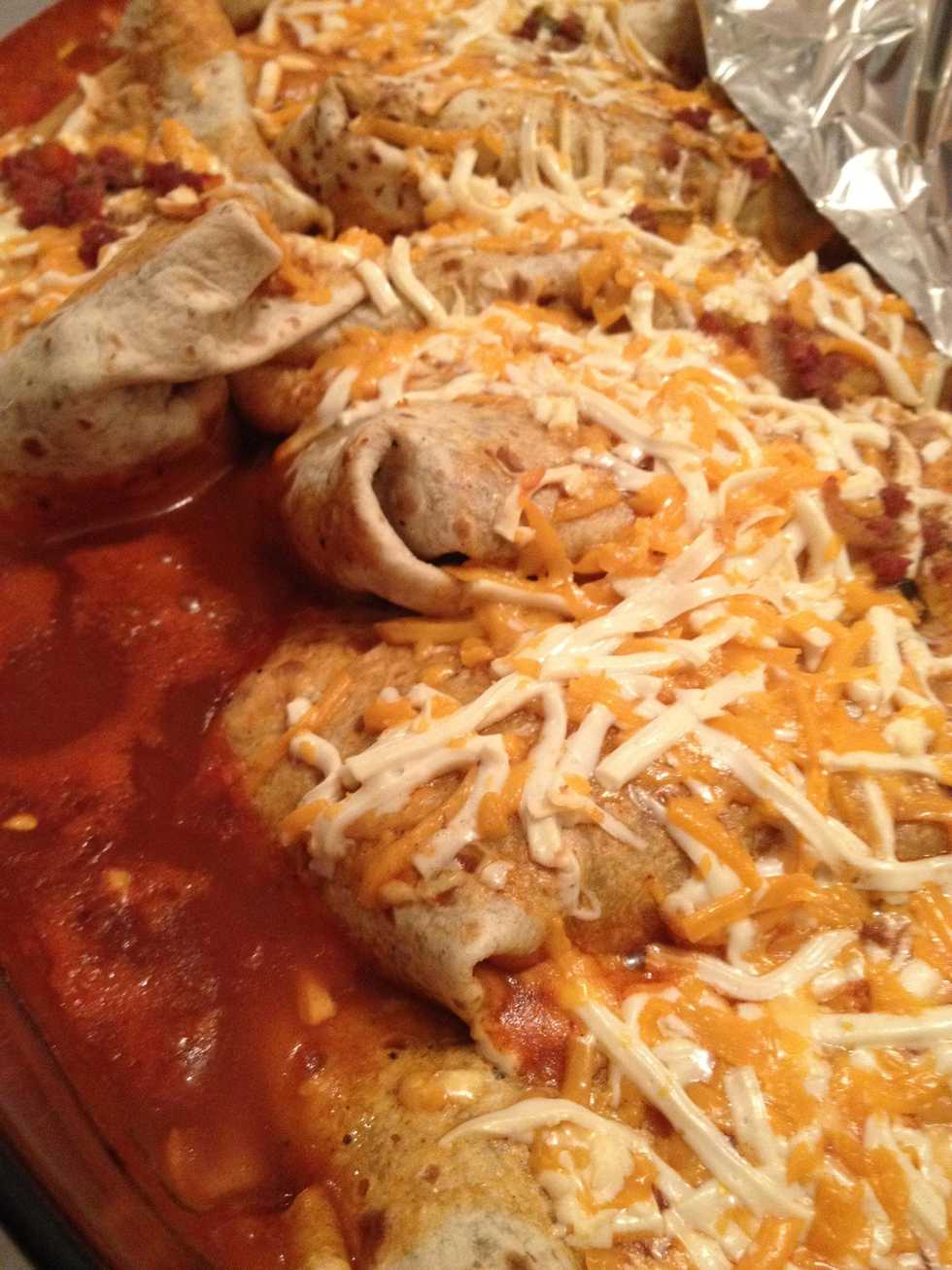 Add the rest of the enchilada sauce on top of the burritos