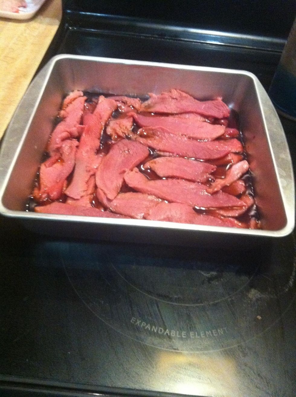 Pour more sauce in as you stack more meat in. Let it marinate overnight.